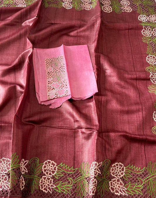 Maroon Hand Cutwork Tussar Ghicha Silk Saree