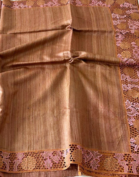 Brown Hand Cutwork Tussar Ghicha Silk Saree