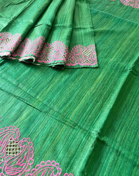 Green Hand Cutwork Tussar Ghicha Silk Saree