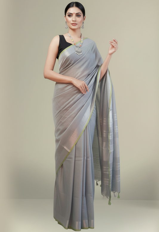 Chic Grey Cotton Slub Saree with Lime Green Contrast Border & Silver Striped Pallu