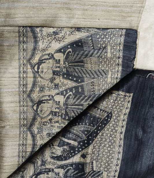 Grey Tussar Ghicha Buta Madhubani Printed Silk Saree