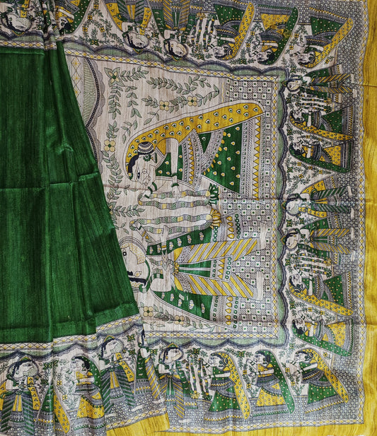 Radha-Krishna Printed Green Tussar Ghicha Silk Saree