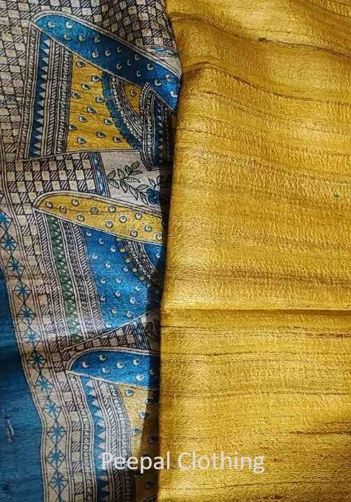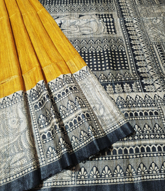 Yellow Tussar Ghicha Madhubani Printed Silk Saree