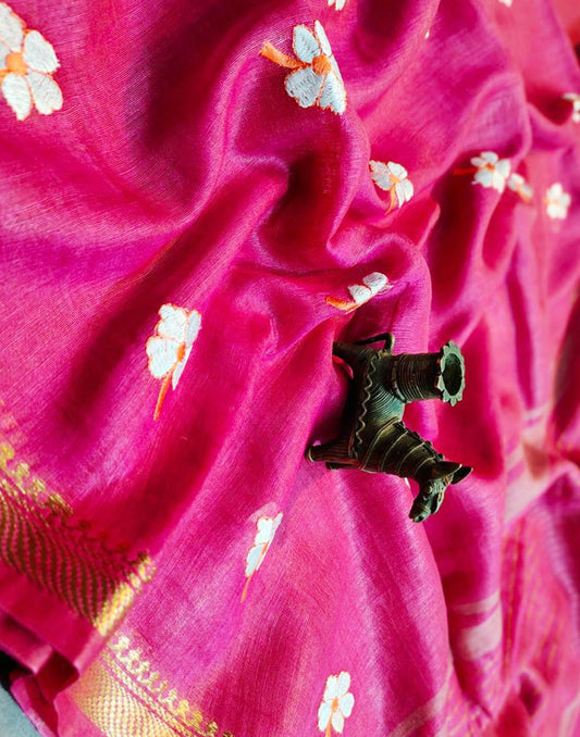 Silk Linen Sarees- This very light silky fabric with subtle nubs and slubs of flax linen is ideal for creating traditional festive sarees for ladies and is extremely in demand due to its rich and shiny look. Handloom silk linen saree is made by interlacing of warp and weft yarn on pit loom or frame loom without the use of any electricity.