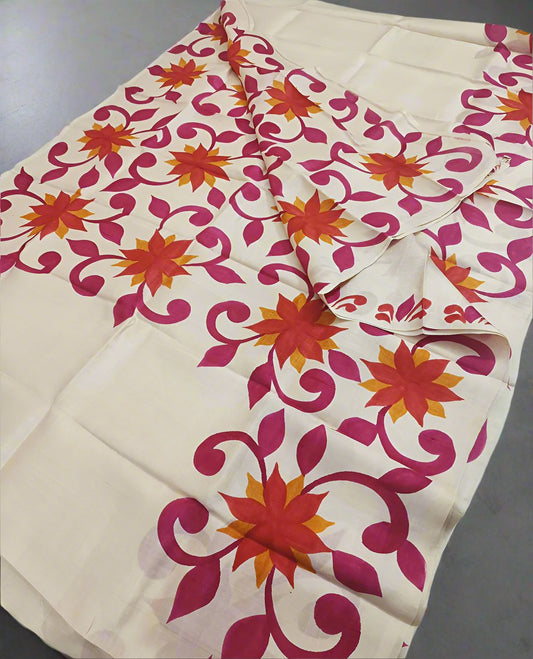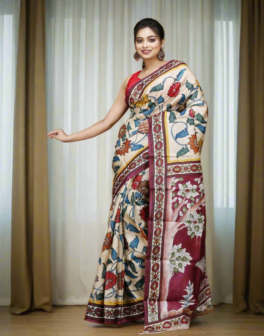 Hand Painted Floral Off-white Kalamkari Tussar Silk Saree