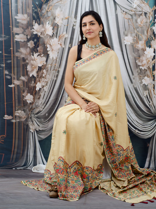 Beige Madhubani Hand Painted Natural Crepe Saree