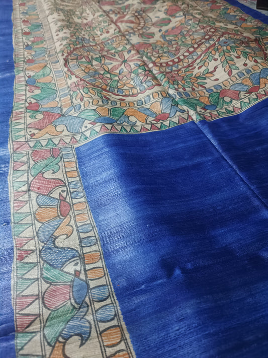 Blue Tassar Ghicha Madhubani Hand Painted Saree