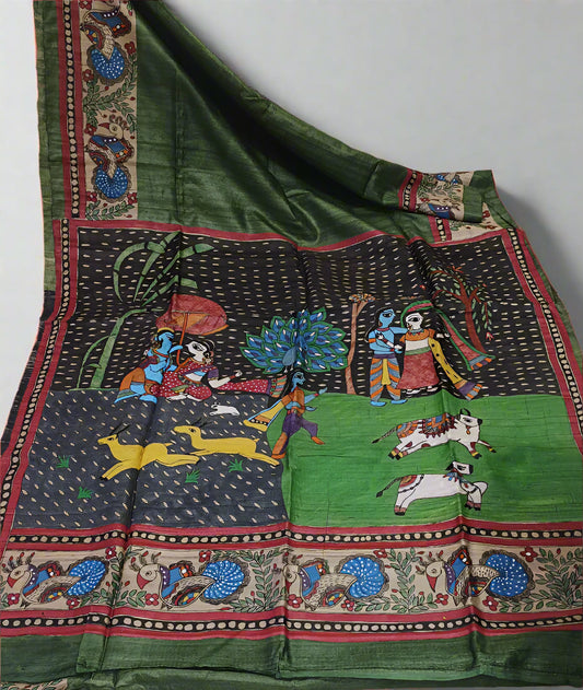 Dark Green Madhubani Hand-Painted Desi Tussar Silk Saree