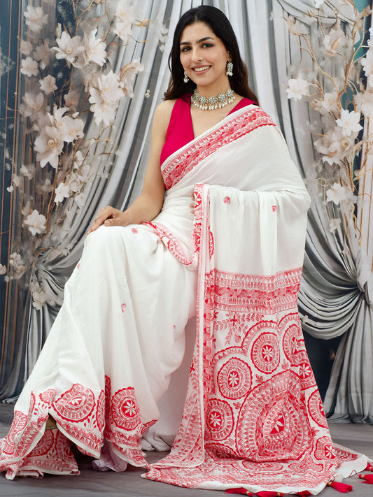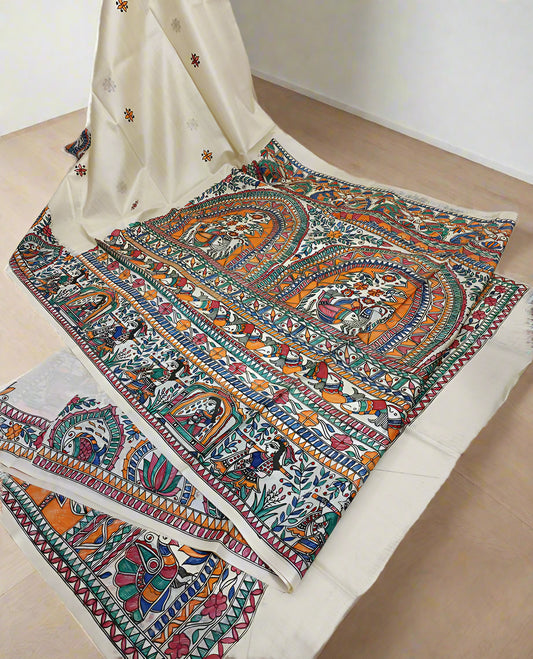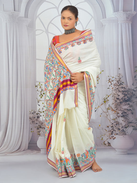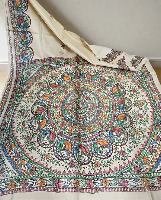 Off-white Madhubani Hand Painted Natural Crepe Saree