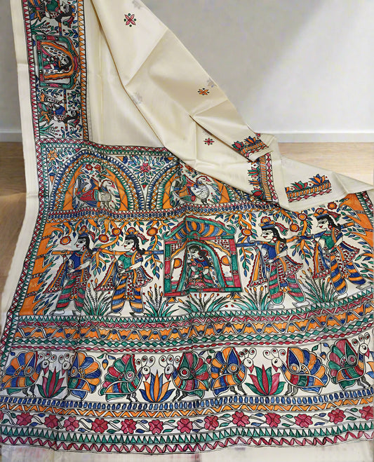 Radha Krishna Madhubani Hand Painted Desi Tussar Silk Saree
