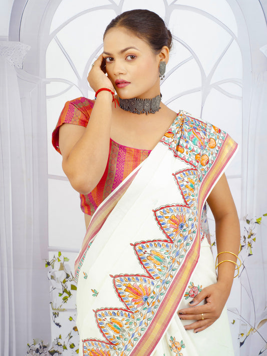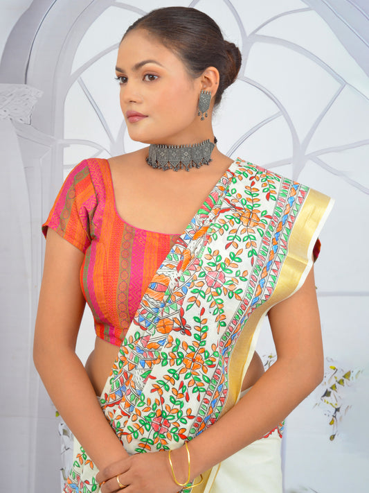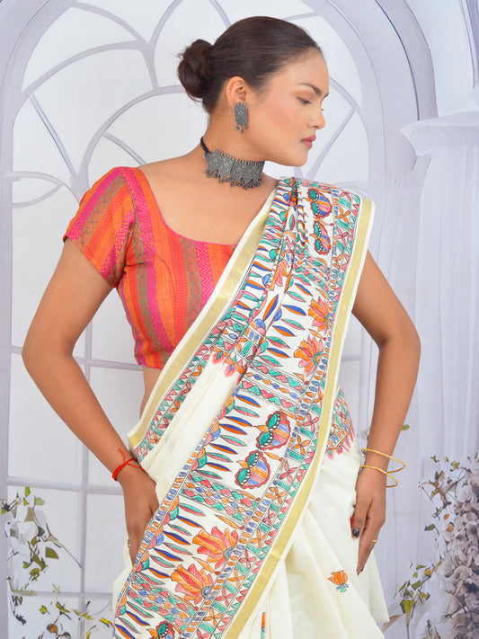 Floral Madhubani Hand-Painted Kerala Cotton Saree
