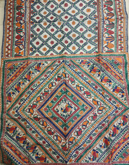 Triangular Frame Madhubani Hand Painted Desi Tussar Silk Saree