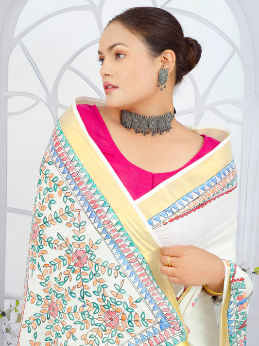 Hand-Painted Floral Madhubani Kerala Saree with Golden Zari Border