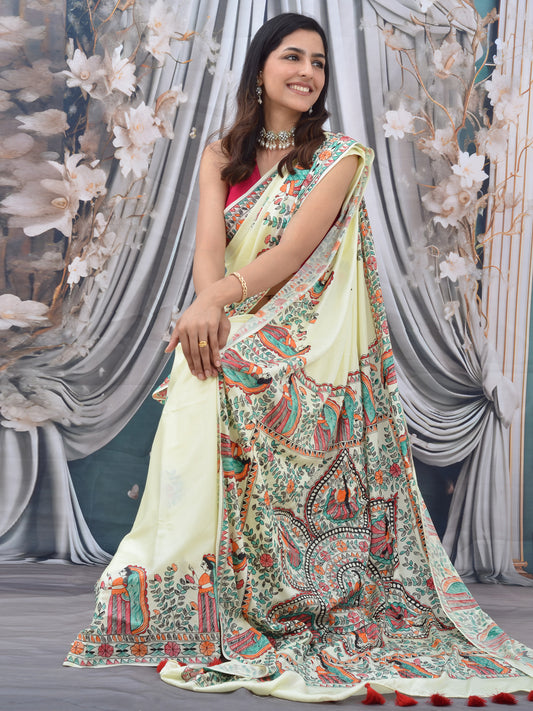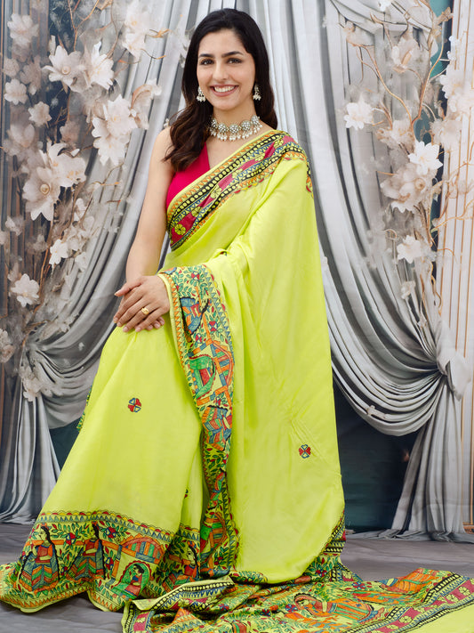 Lemon Green Madhubani Hand Painted Natural Crepe Saree