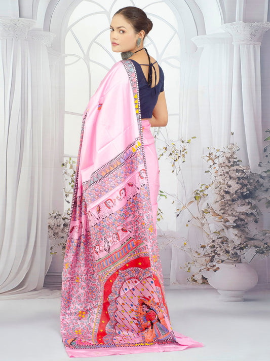 Pink Madhubani Hand Painted Natural Crepe Saree