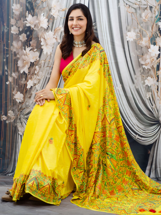 Yellow Tassar Ghicha Madhubani Hand Painted Saree