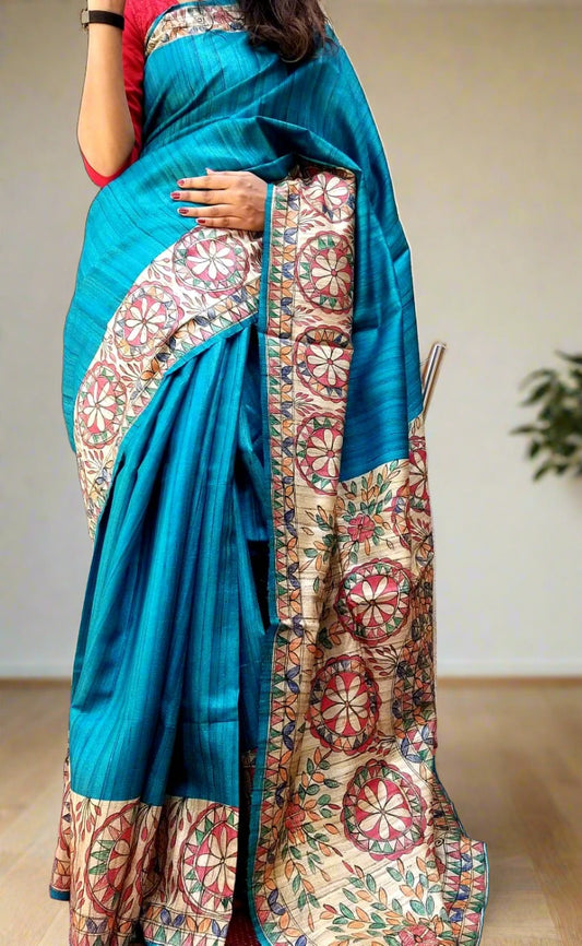 Firozi Tassar Ghicha Madhubani Hand Painted Saree
