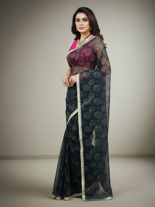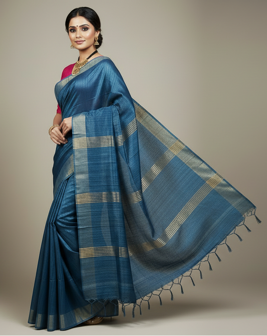 Prussian Blue Handloom Tussar Ghicha Silk Saree