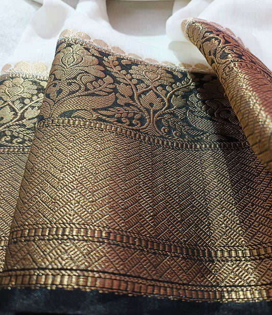 White Pure Banarasi Silk Linen Saree with Contrast Black Border
