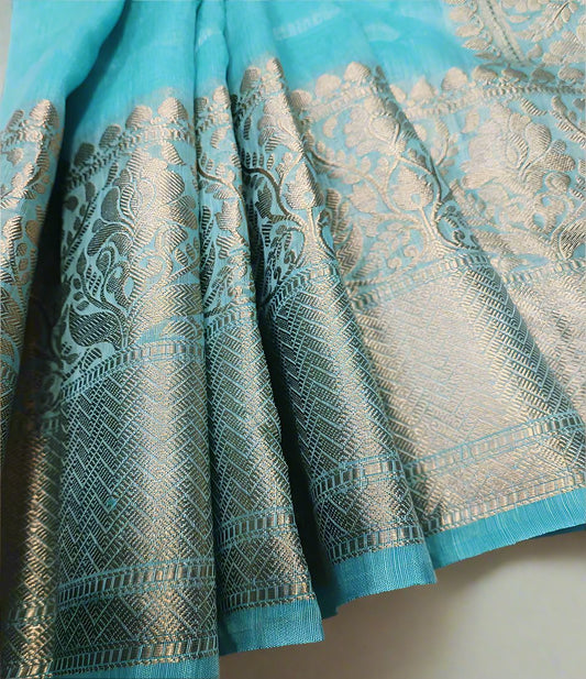 Aqua Green Pure Silk Linen Banarasi Saree With Silver Border