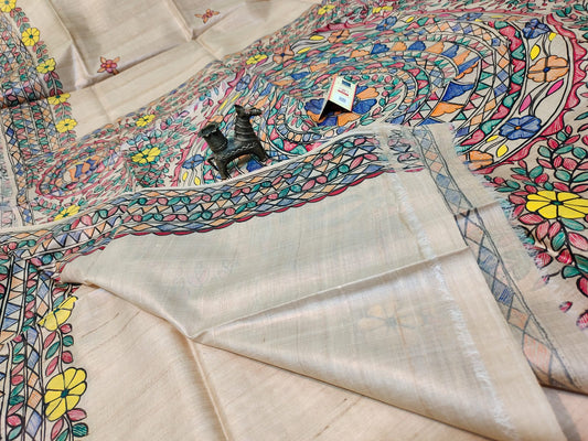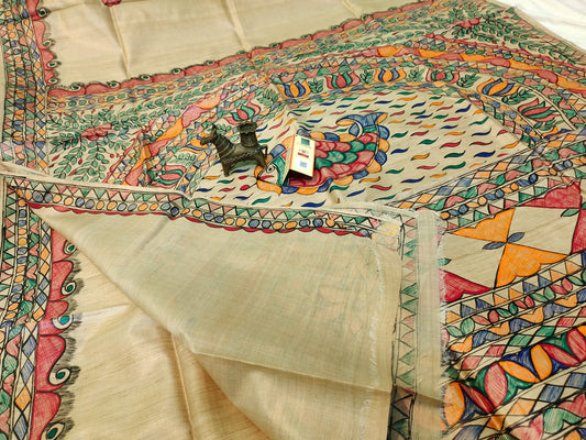 Mathi Madhubani Hand Painted Pure Desi Tussar Silk Saree