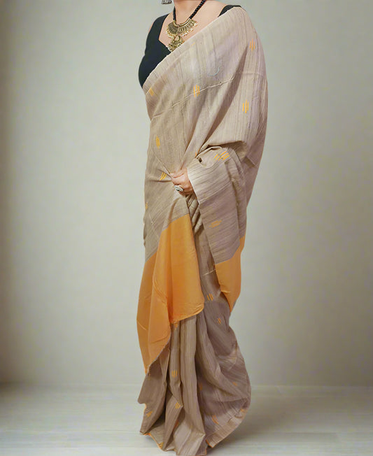 Peach And Grey Handloon Tussar Ghicha Silk Saree