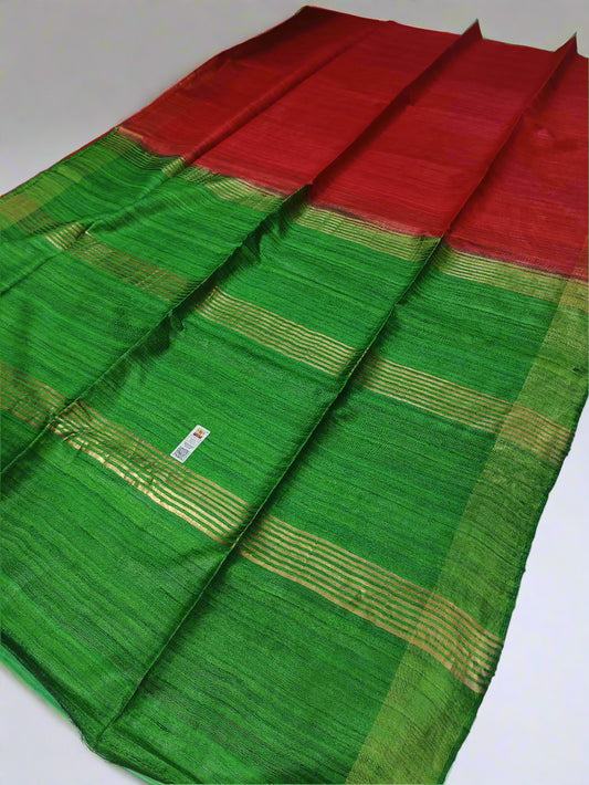 Red And Green Handloon Tussar Ghicha Silk Saree
