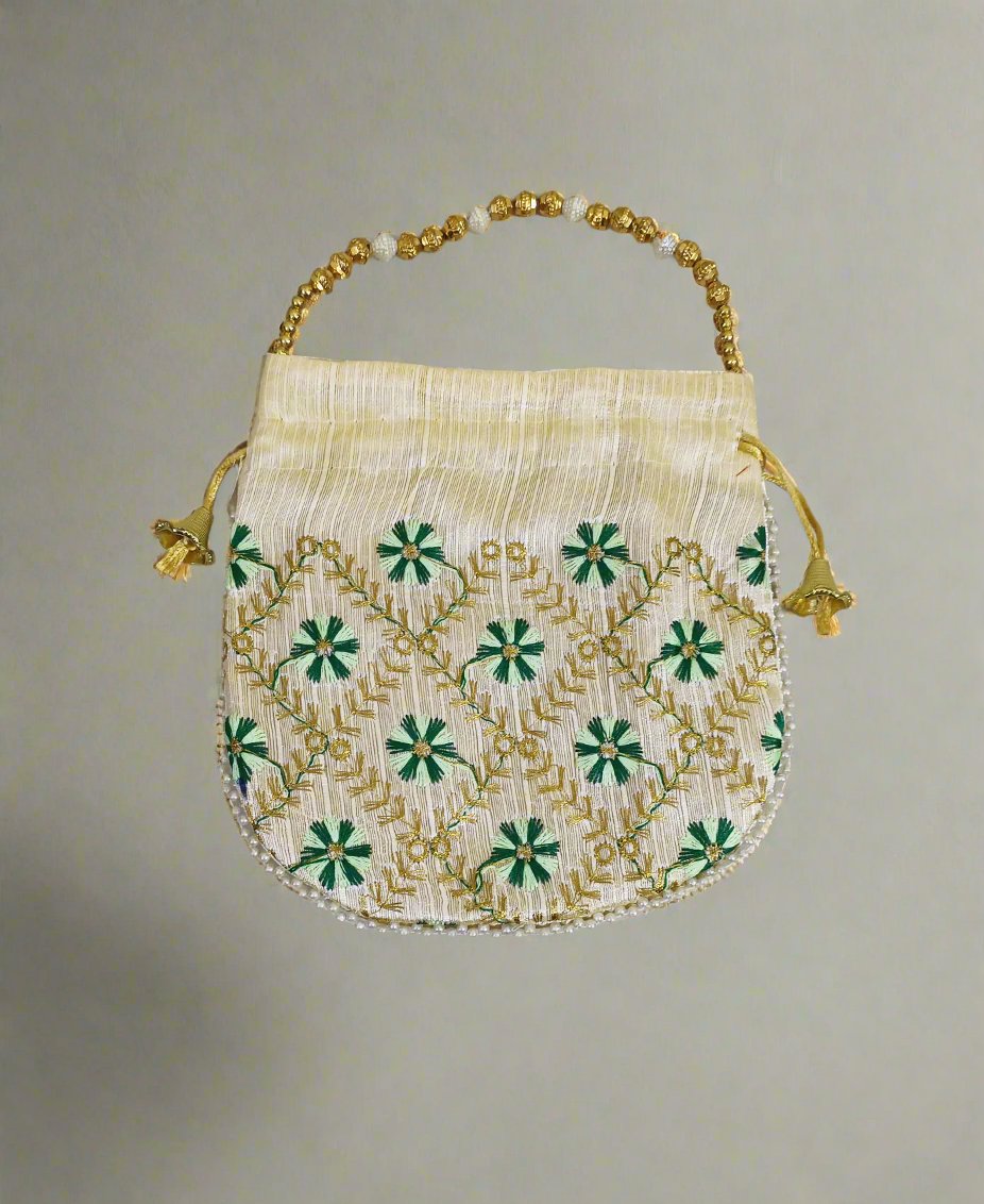 Barfi-Pattern Off-White Potli with Green Embroidery