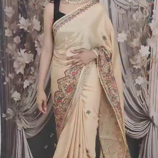 Beige Madhubani Hand Painted Natural Crepe Saree