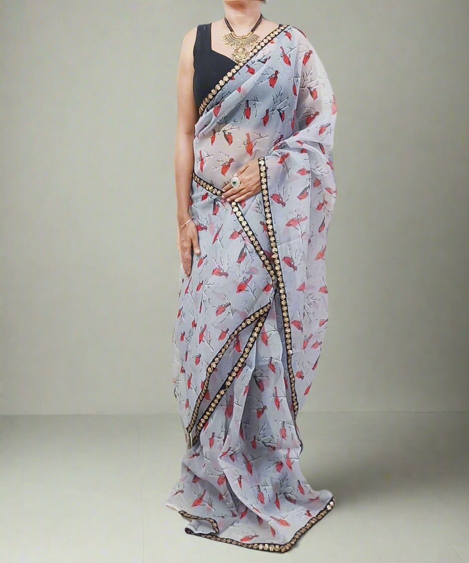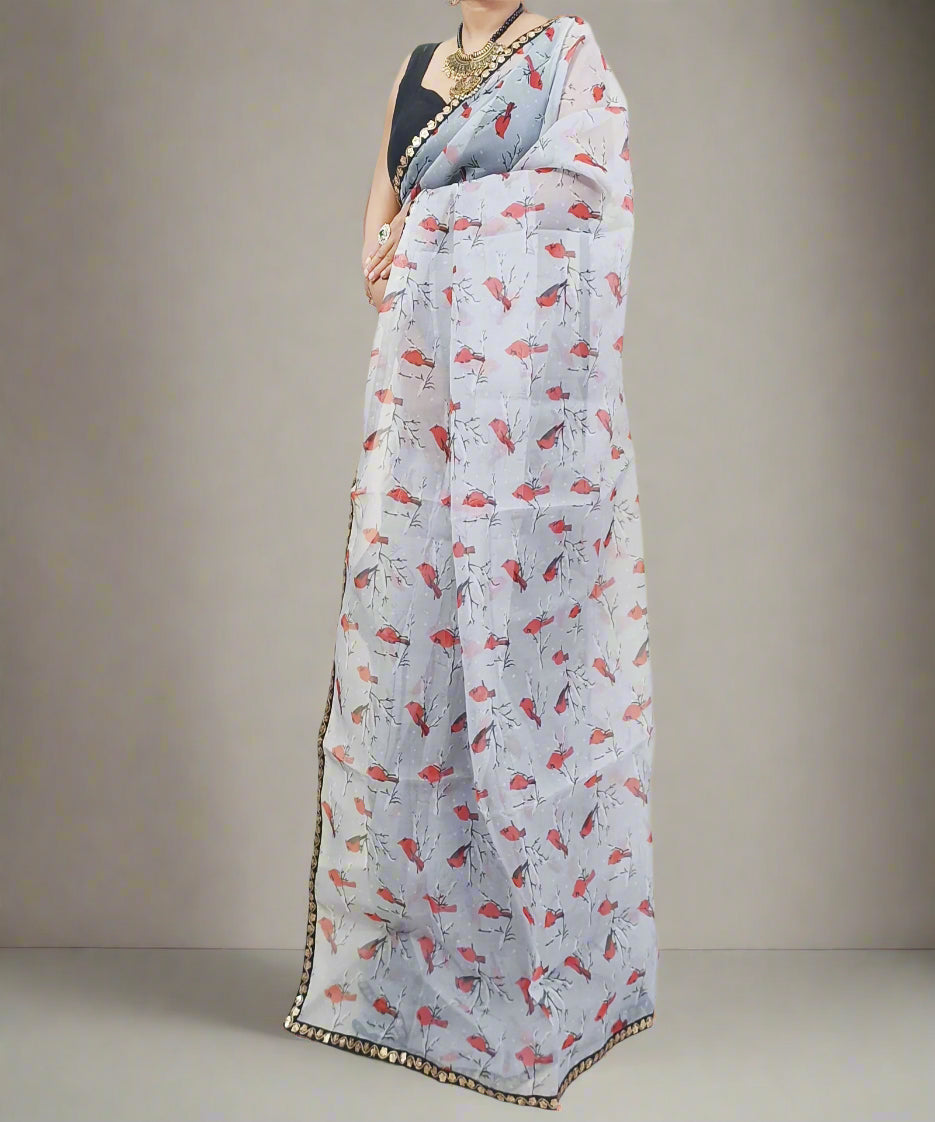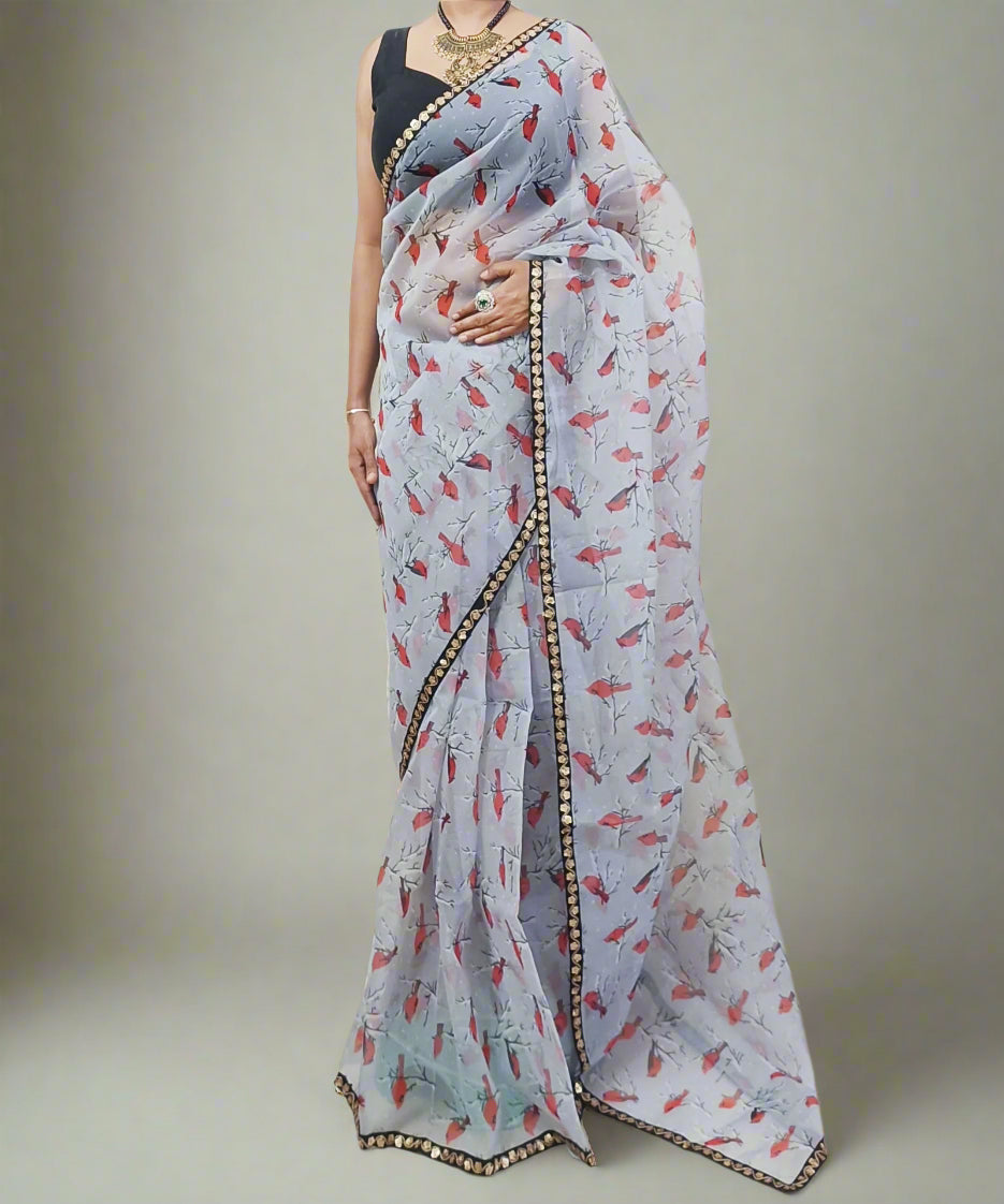 Show your ultra sophisticated look with this bird printed organza saree with contrast raw silk blouse piece. Embellished with border lace.