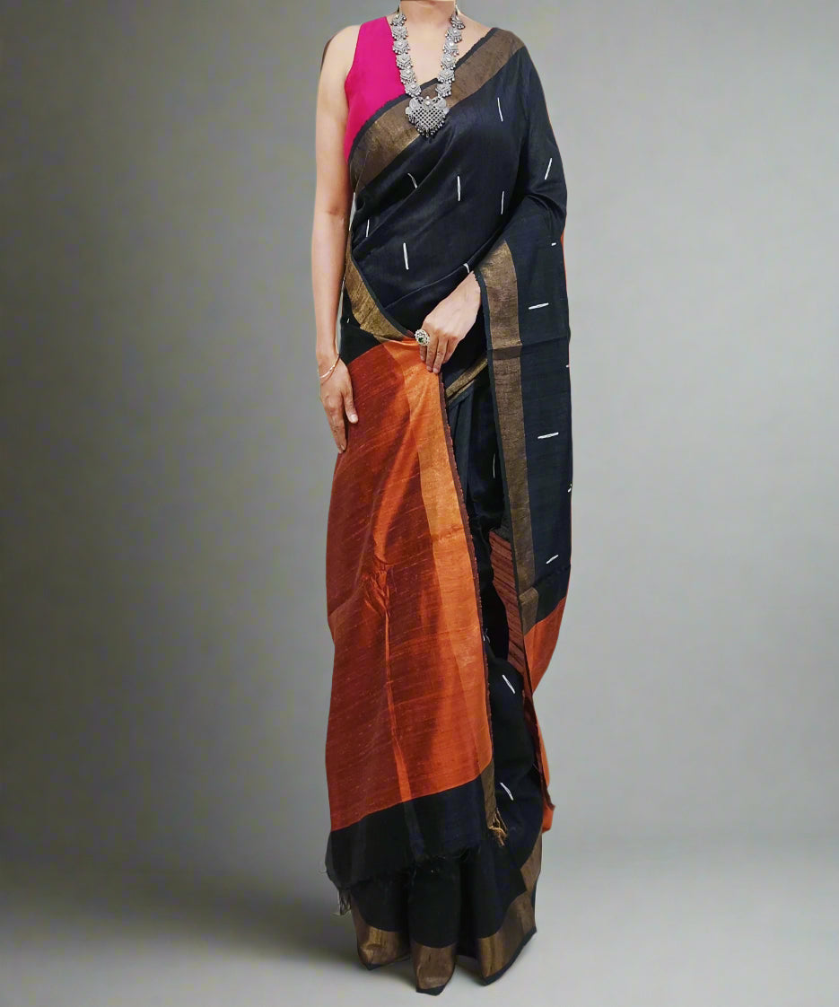 Wash & care: Dry Wash, Do Not Bleach. More DetailsElegance is something that will never go out of style. Walk around in this elegant black and bronze tussar raw... Read More
