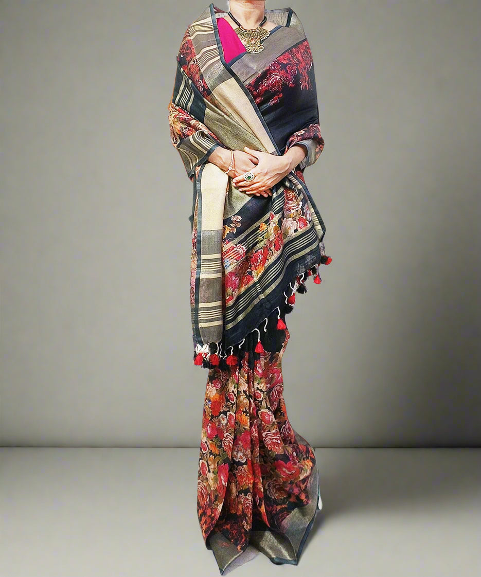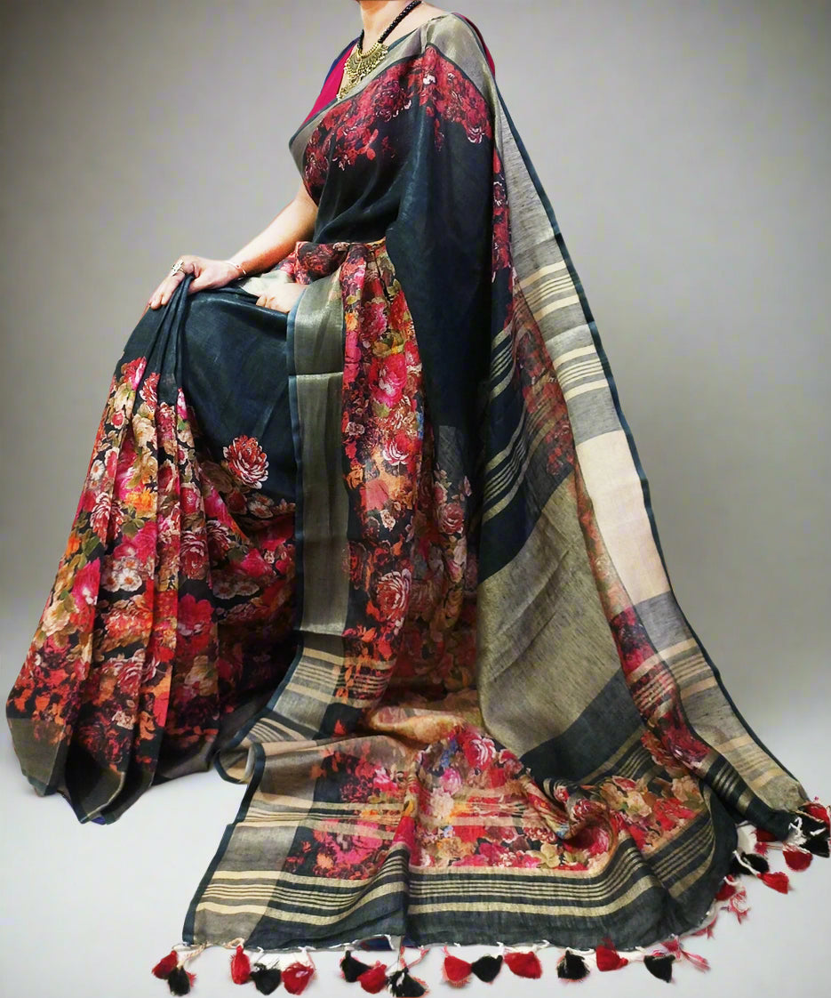 Drape this black floral printed linen saree with narrow zari border around you and stand out from the crowd. Linen sarees are best for office wear. One can go with simple neat look by accessorizing it with minimal jewellery and clean hair do. Pair your sophisticated linen saree with matching or plain blouse. Make it a style statement by creative draping and contrast blouse. Because of the simplicity of a linen saree, you can be more daring with your accessories.