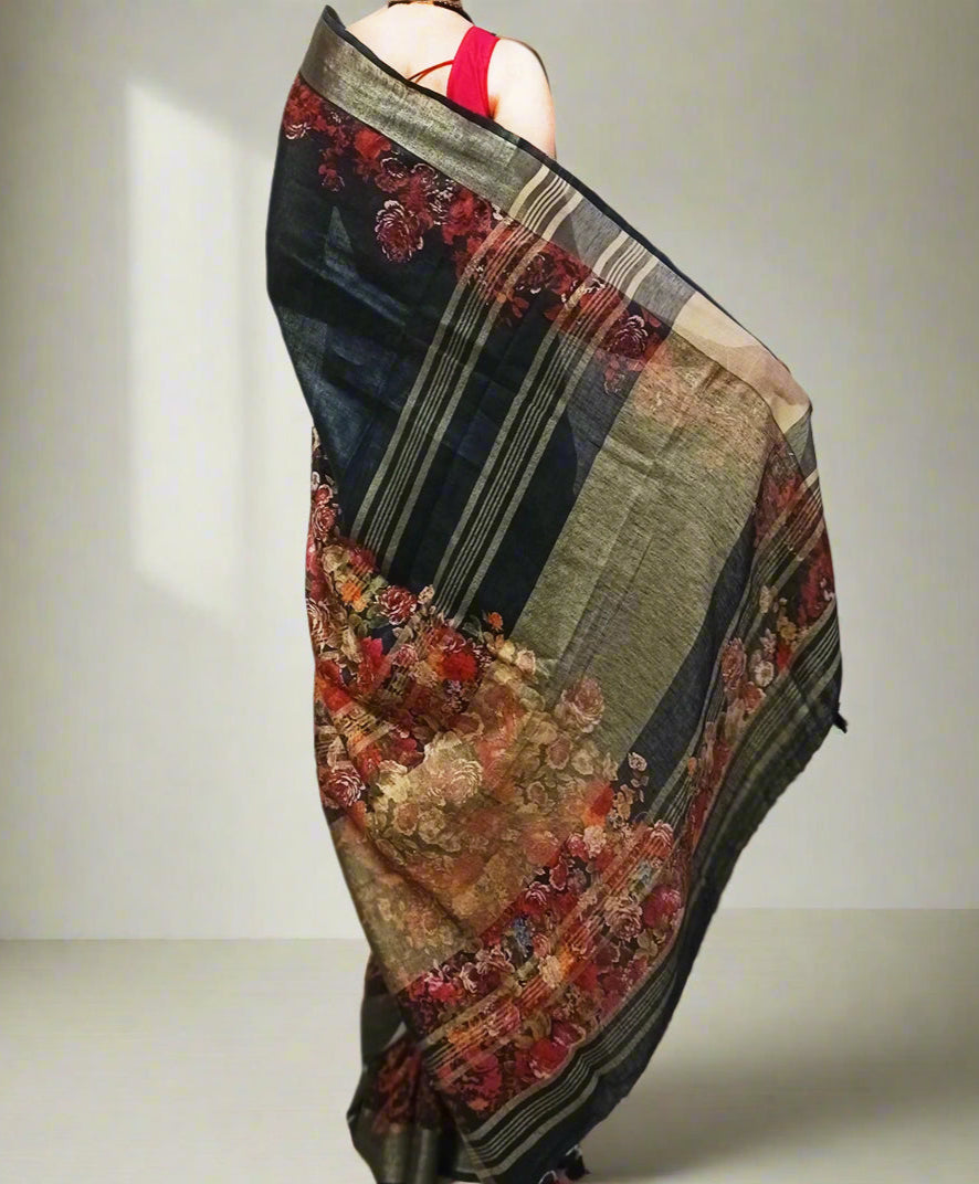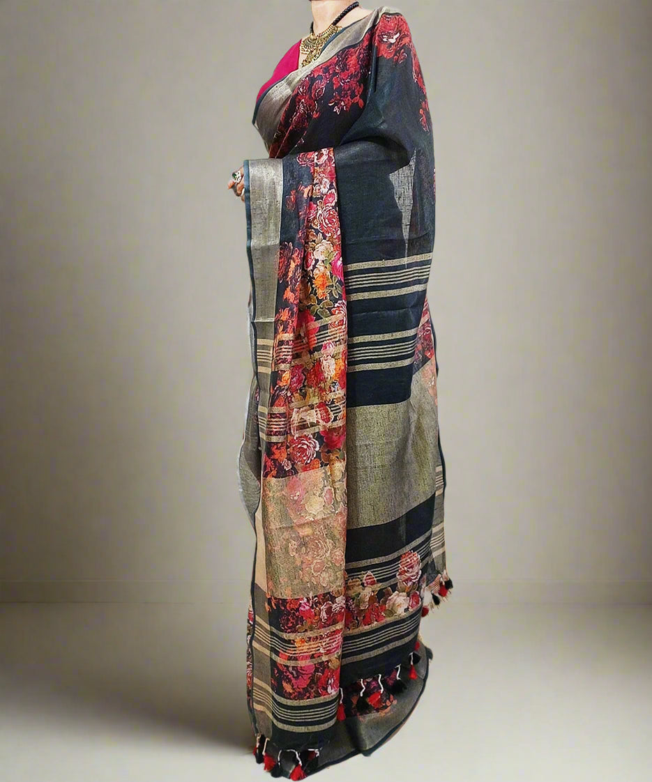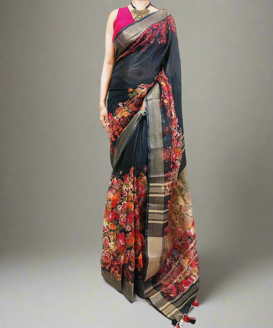 Wash & care: Dry Clean and Gentle Hand Wash, Do Not Bleach.Drape this black floral printed linen saree with narrow zari border around you and stand out from the crowd. Linen... Read More