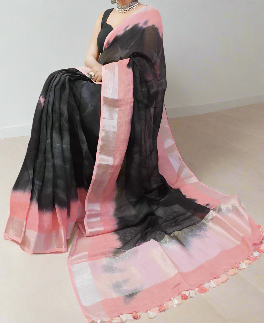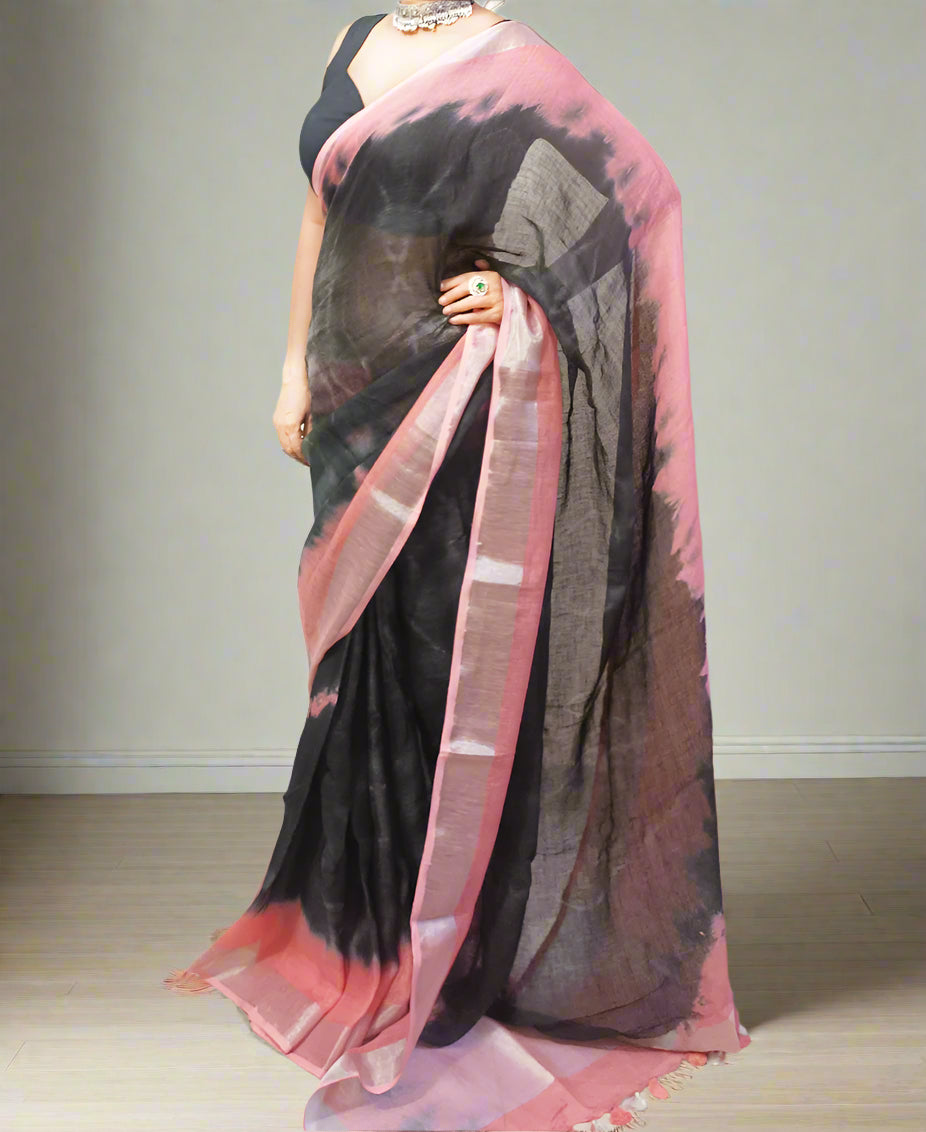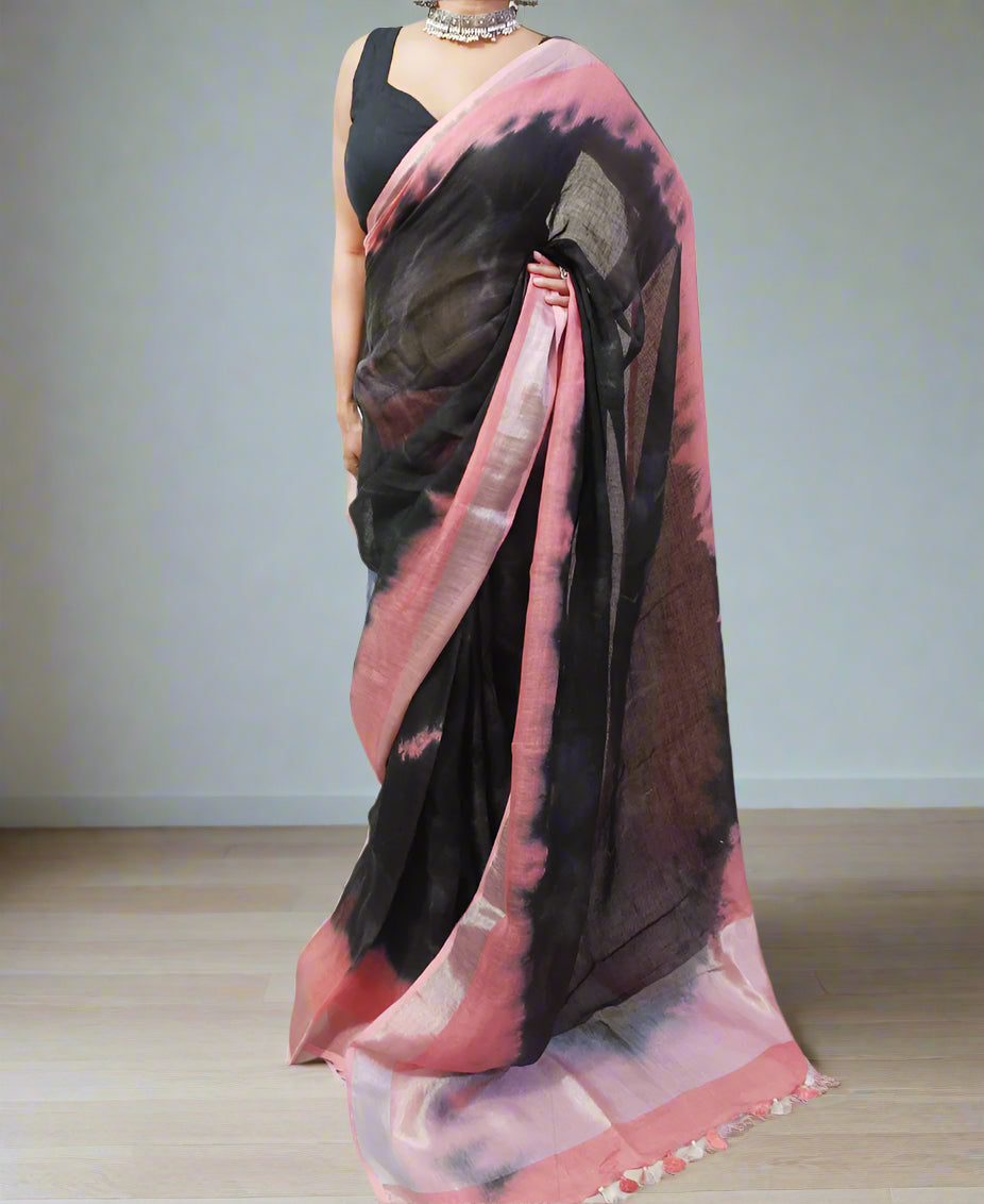 Introducing our exquisite Black Tie & Dye Pure Linen Saree, a timeless and elegant piece that seamlessly combines traditional craftsmanship with contemporary style. Crafted from the finest quality linen, this saree not only boasts a luxurious texture but also offers breathability and comfort, making it perfect for various occasions.