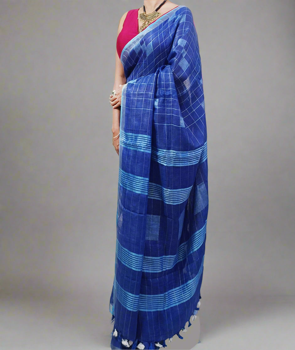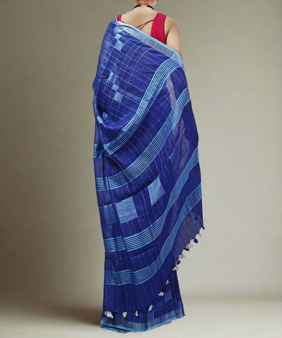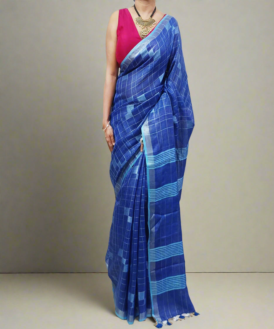 Wash & care: Gentle hand wash, Dry clean, Do not bleach. Dry in shade.Drape this blue linen saree with narrow silver border around you and stand out from the crowd. Linen sarees are... Read More