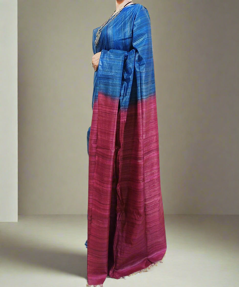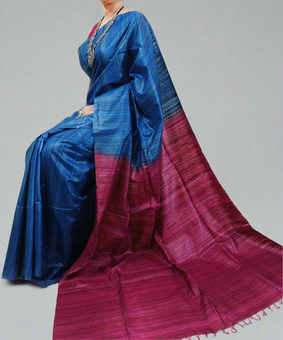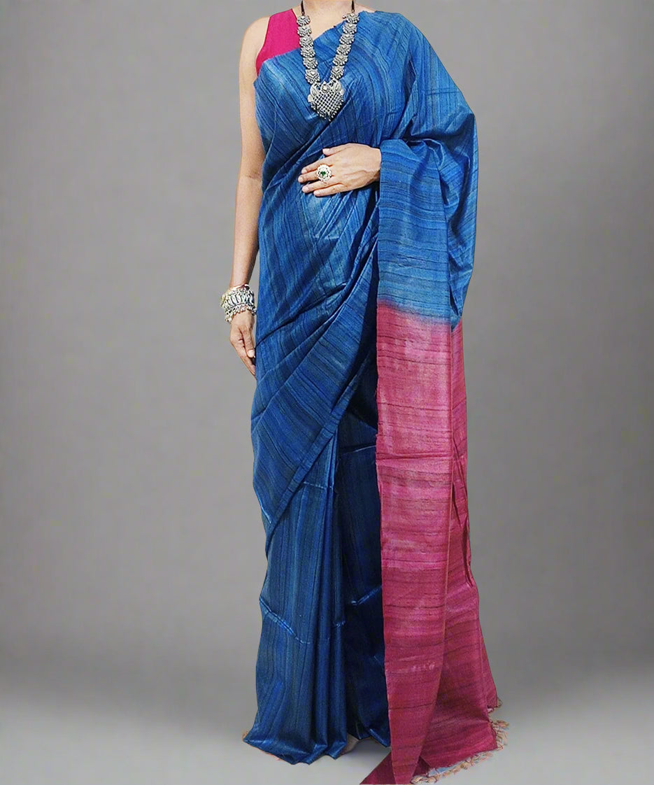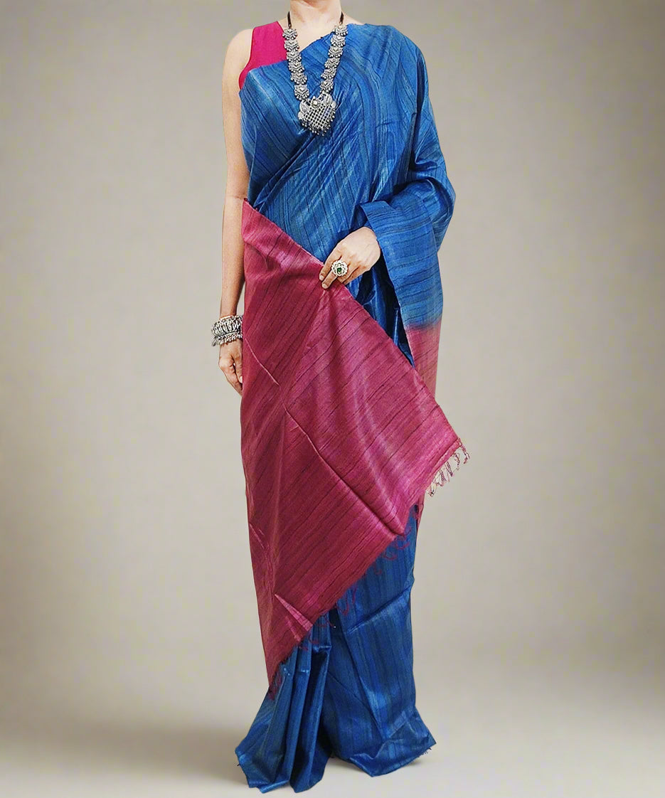 Whether worn at weddings, festivals, or cultural events, the Blue Desi Tussar Silk Saree effortlessly captures attention and exudes a sense of sophistication. Embrace the grace of tradition with a modern twist, as this saree becomes a symbol of timeless beauty and enduring style.