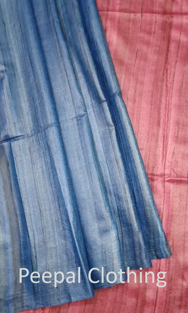Indulge in the timeless elegance of the Blue Desi Tussar Silk Saree, a masterpiece that seamlessly blends traditional craftsmanship with contemporary allure. This ethereal saree is crafted from luxurious Tussar silk, known for its rich texture and natural sheen. The enchanting shade of blue adds a regal touch, making it a perfect choice for special occasions and celebrations.