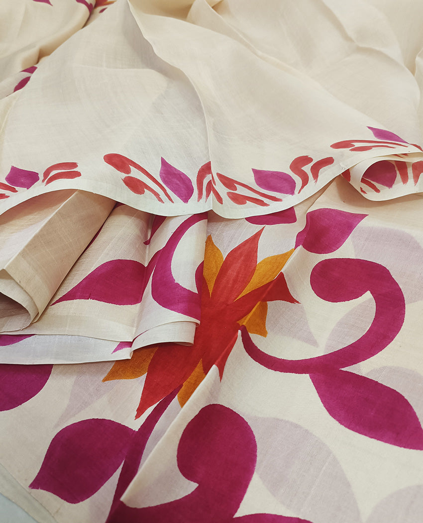 Hand Painted Floral Off-white Kalamkari Tussar Silk Saree