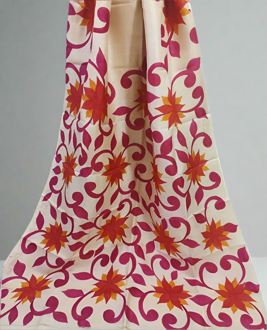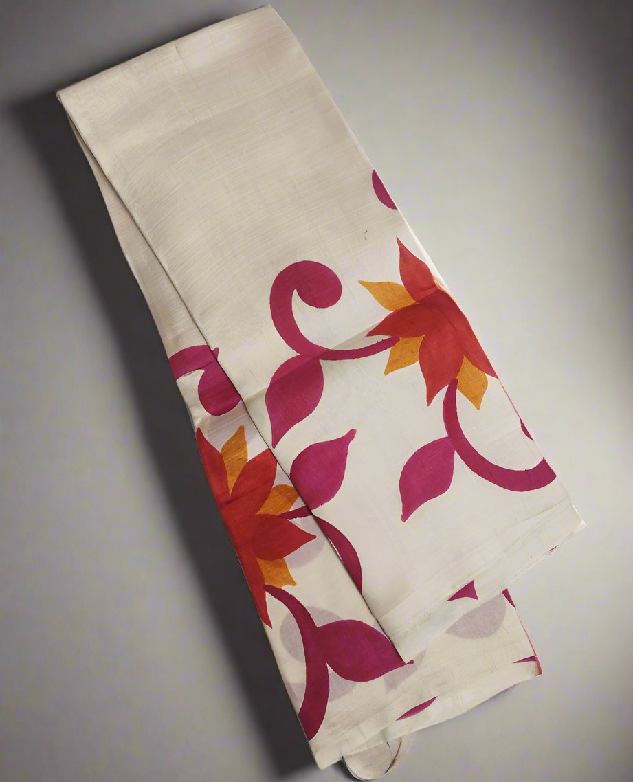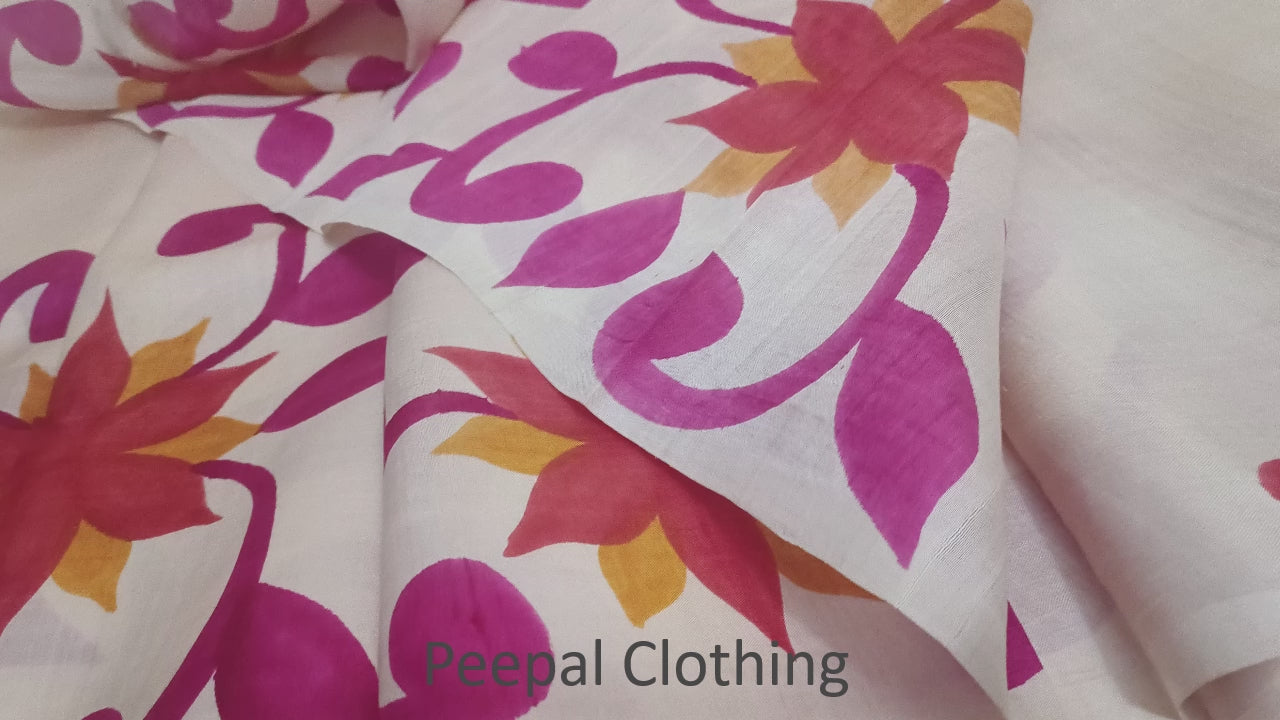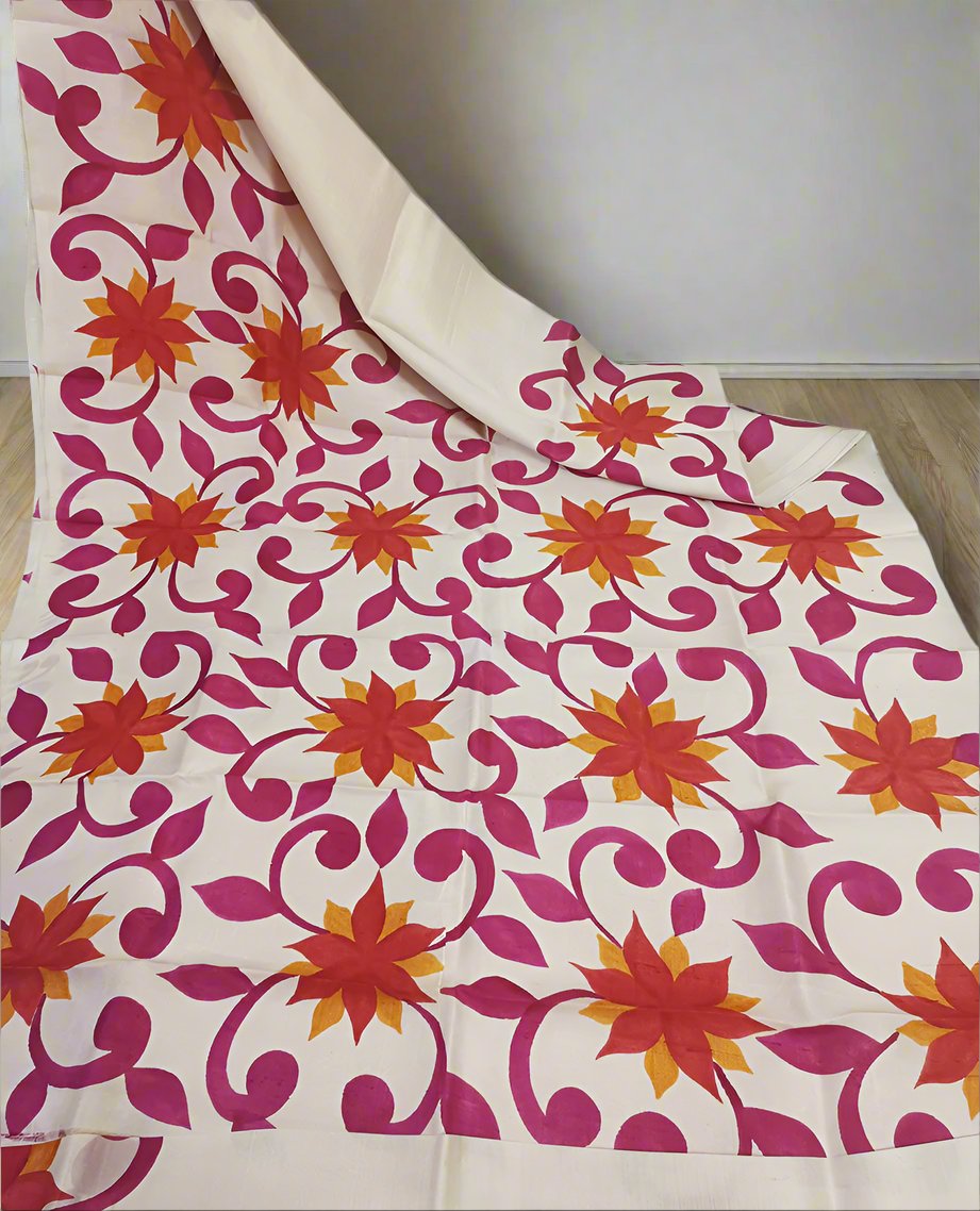 The soft, off-white base serves as a perfect canvas for the vibrant floral patterns, adding a touch of sophistication and grace. Lightweight and versatile, this saree drapes beautifully, making it an ideal choice for both casual gatherings and festive occasions.