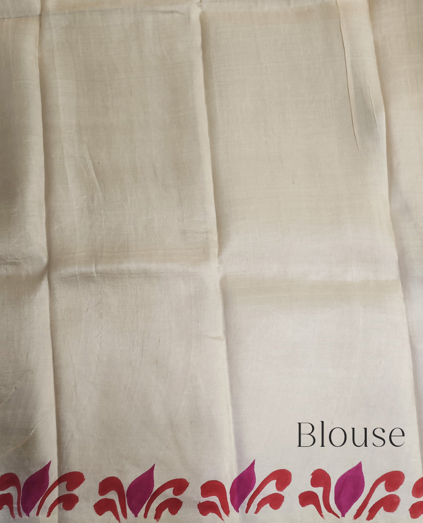 Elevate your ethnic wardrobe with this exquisite hand-painted floral off-white tussar silk saree, a timeless blend of elegance and craftsmanship. Crafted on premium tussar silk, this saree features intricate floral motifs hand-painted with precision, exuding a charm that celebrates traditional artistry.