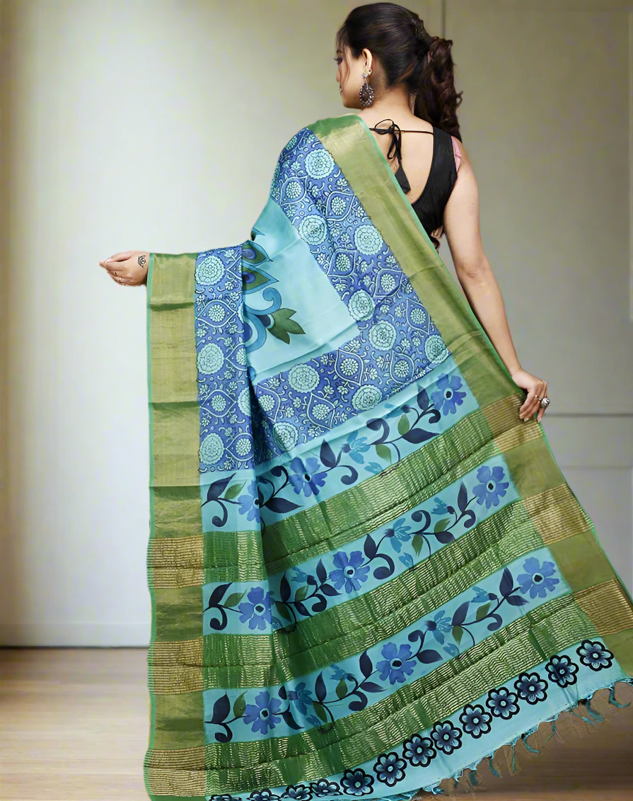 Kalamkari is derived from the word 'Kalam' (pen) and 'Kari' (craftsmanship). Earlier used to be named as 'Pattachitra' a sanskrit word where 'patta' means cloth and 'chitra' is picture. The art of hand painting done on fabrics with the use of a pen or block. Kalamkari patterns used on kalamkari sarees tend to have a perspective that appears to be viewed from the top. The same perspective is used to create the images because these were thought to be scenes viewed by celestial entities. Earlier Kalamkari art was as religious paintings that depicted Indian Gods. In current generation printed kalamkari is a new craze as it is a combination of traditional and modern trends. Fashion industry also helped artisans for practicing this art and also beautifully portrayed kalamkari sarees on fashion runways and got a welcoming response.