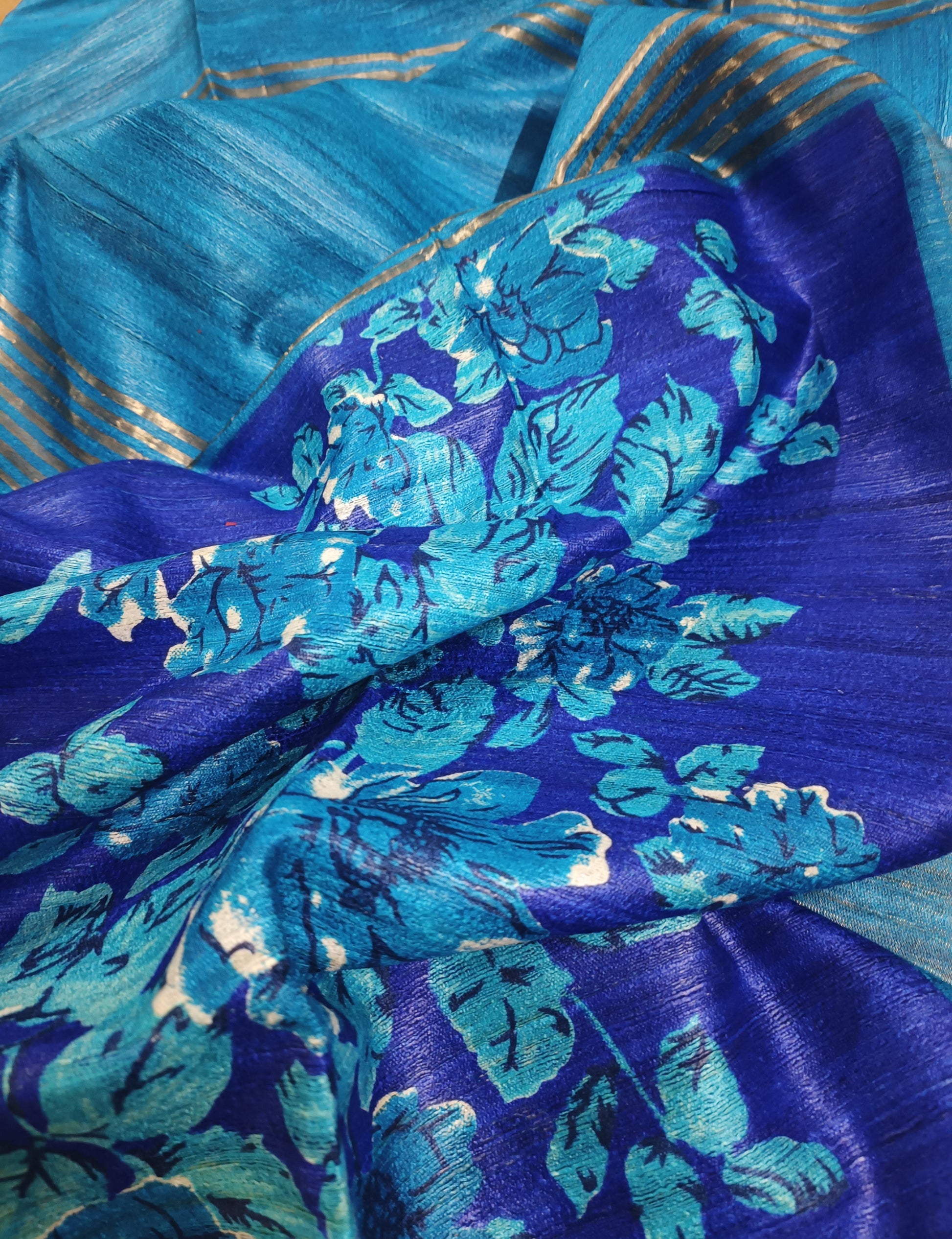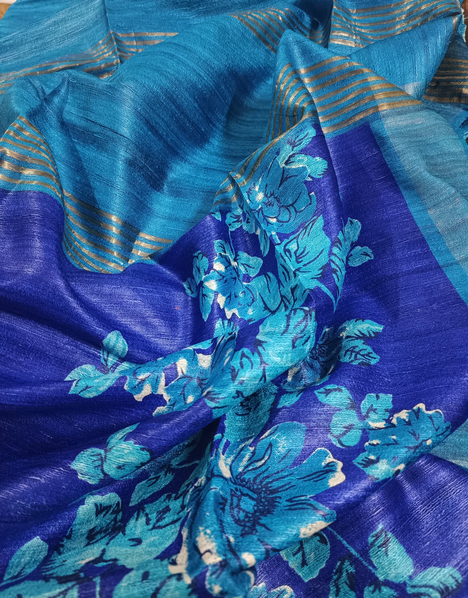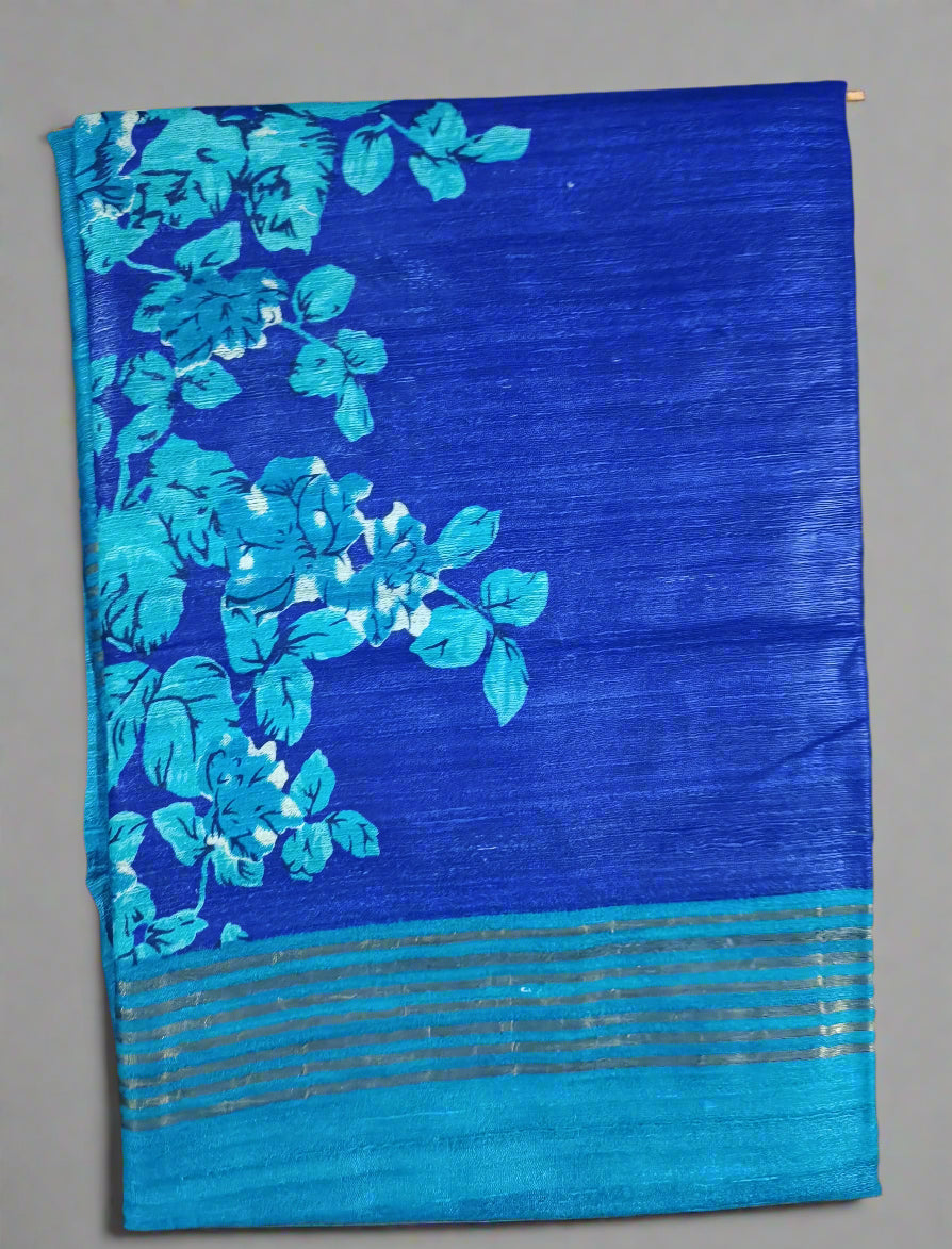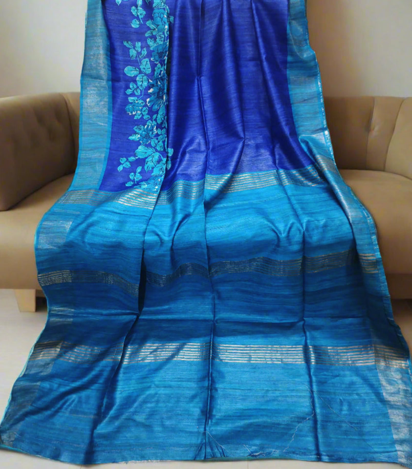 Blue Floral Printed Tussar Ghicha Silk Saree with Zari Border