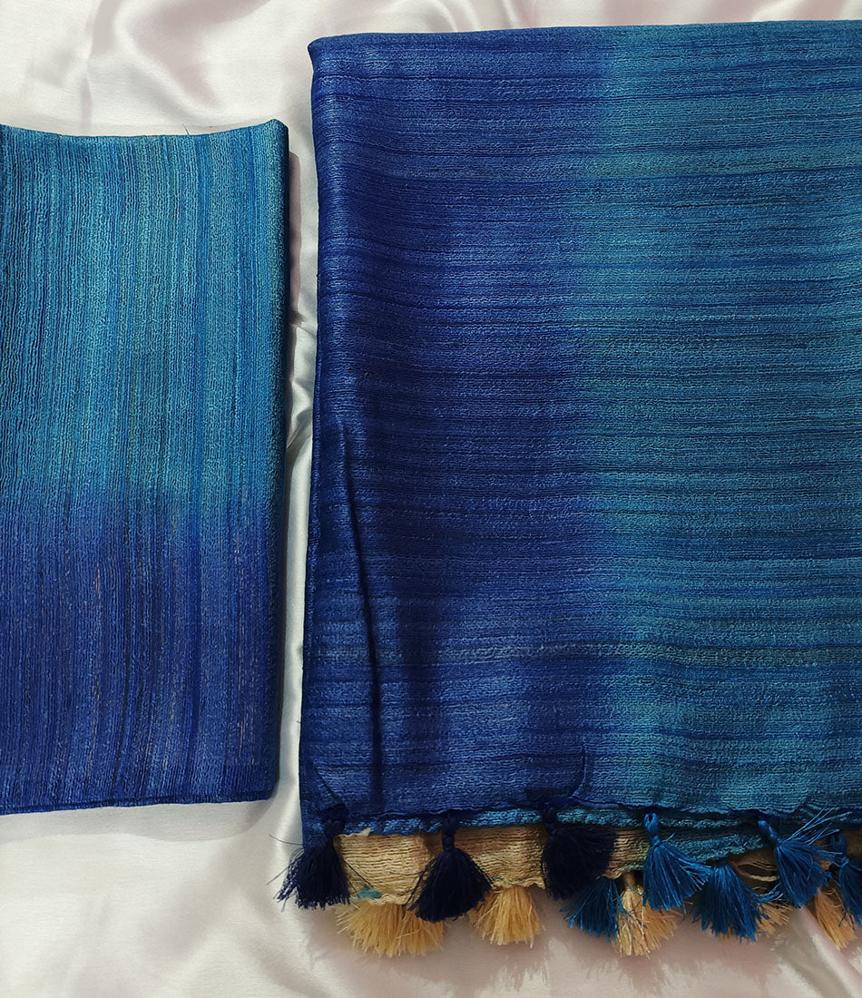 Blue Triple Dye Pure Tussar Ghicha Silk Saree