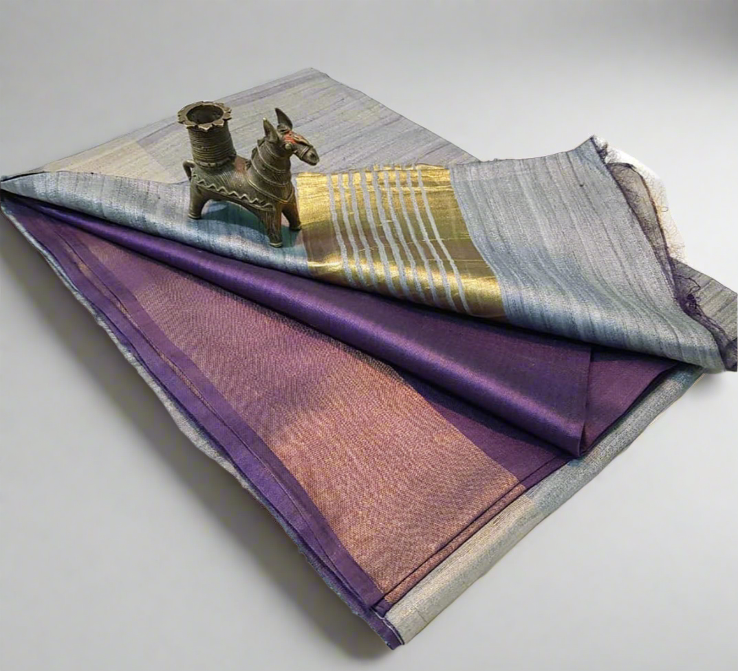 Enrich your wardrobe with elegant Korean tussar ghicha pallu & staple body with golden Zari border silk sarees with running striped blouse piece. Choose this handloom silk saree made from high quality silk yarn to complete your elegant yet classy look. An effortless style statement for your formal and party look.