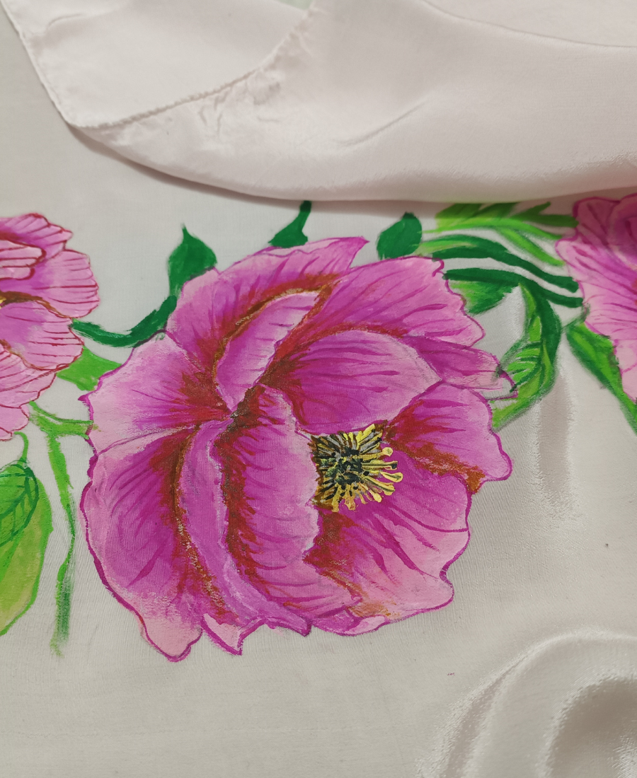 Each flower is carefully painted by hand, making every piece truly one-of-a-kind. The fluid drape of crepe silk adds graceful movement, while handcrafted tassels with pearl accents enhance its artisanal charm.