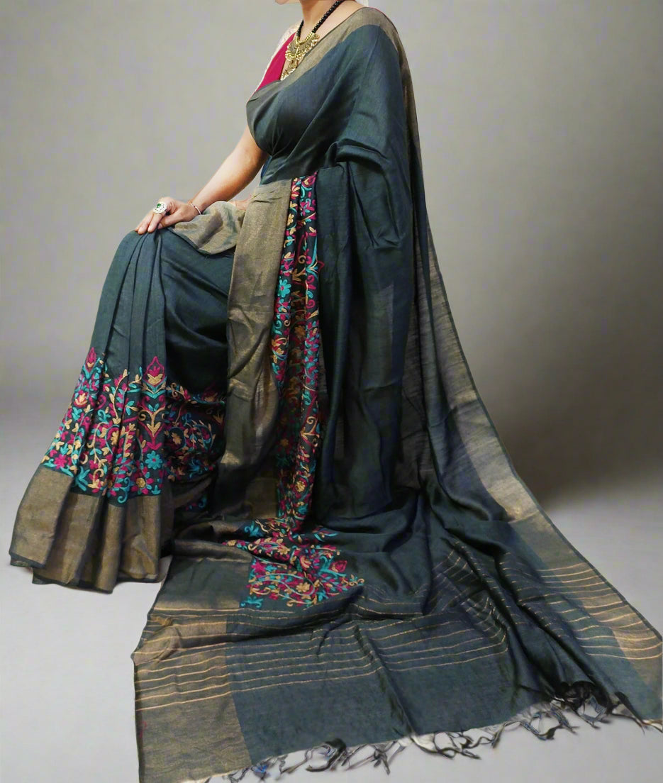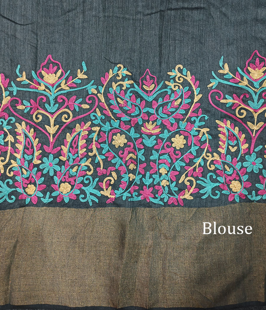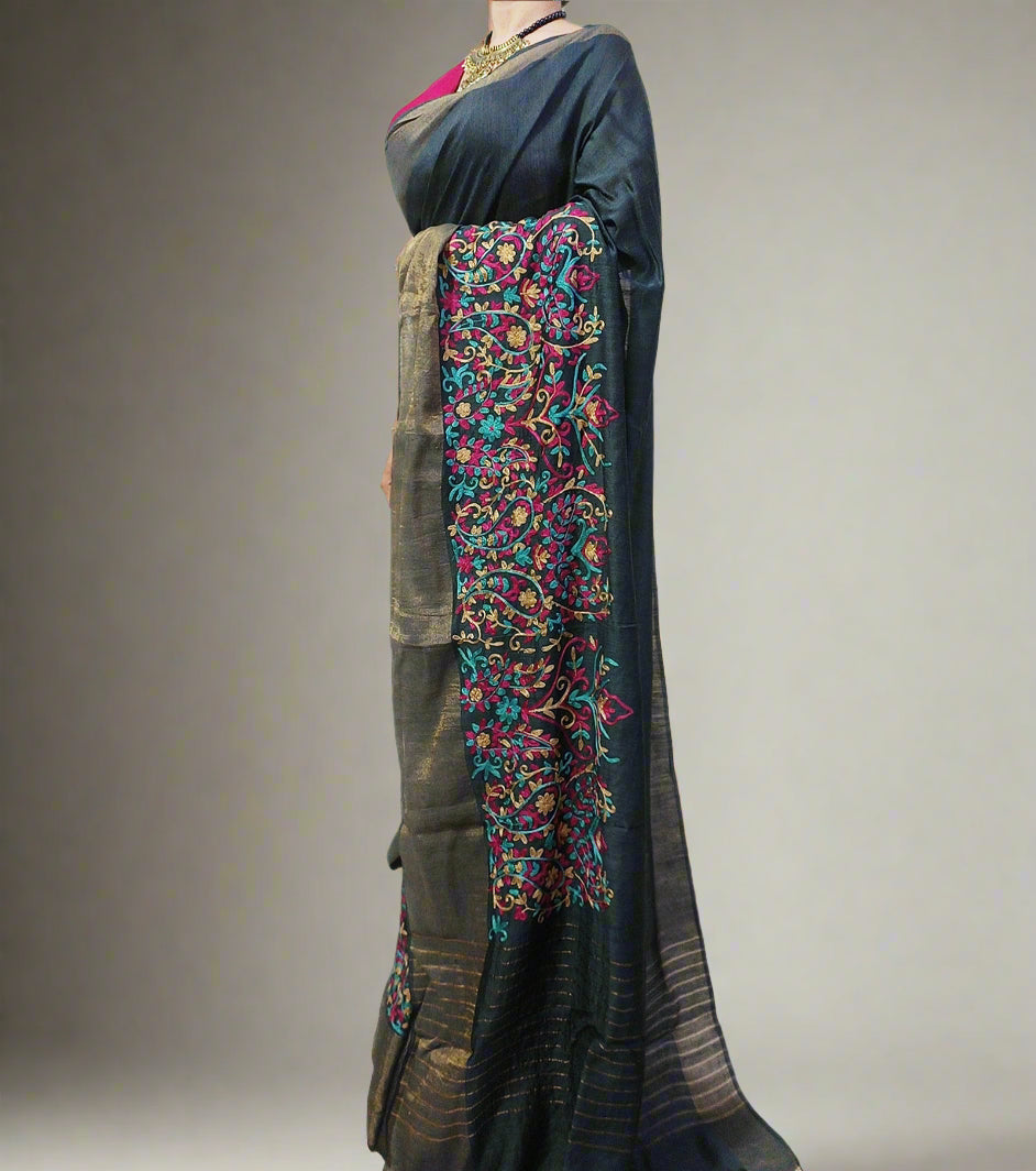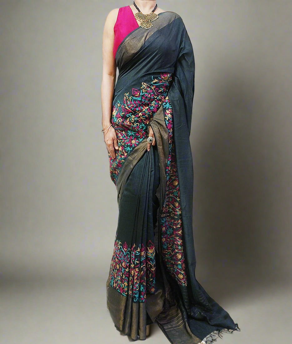 Embrace the timeless allure of Indian heritage with our embroidered border tussar munga silk saree, a masterpiece that epitomizes the seamless fusion of classic aesthetics and contemporary charm, perfect for the modern woman who appreciates the grace and grandeur of traditional Indian attire.