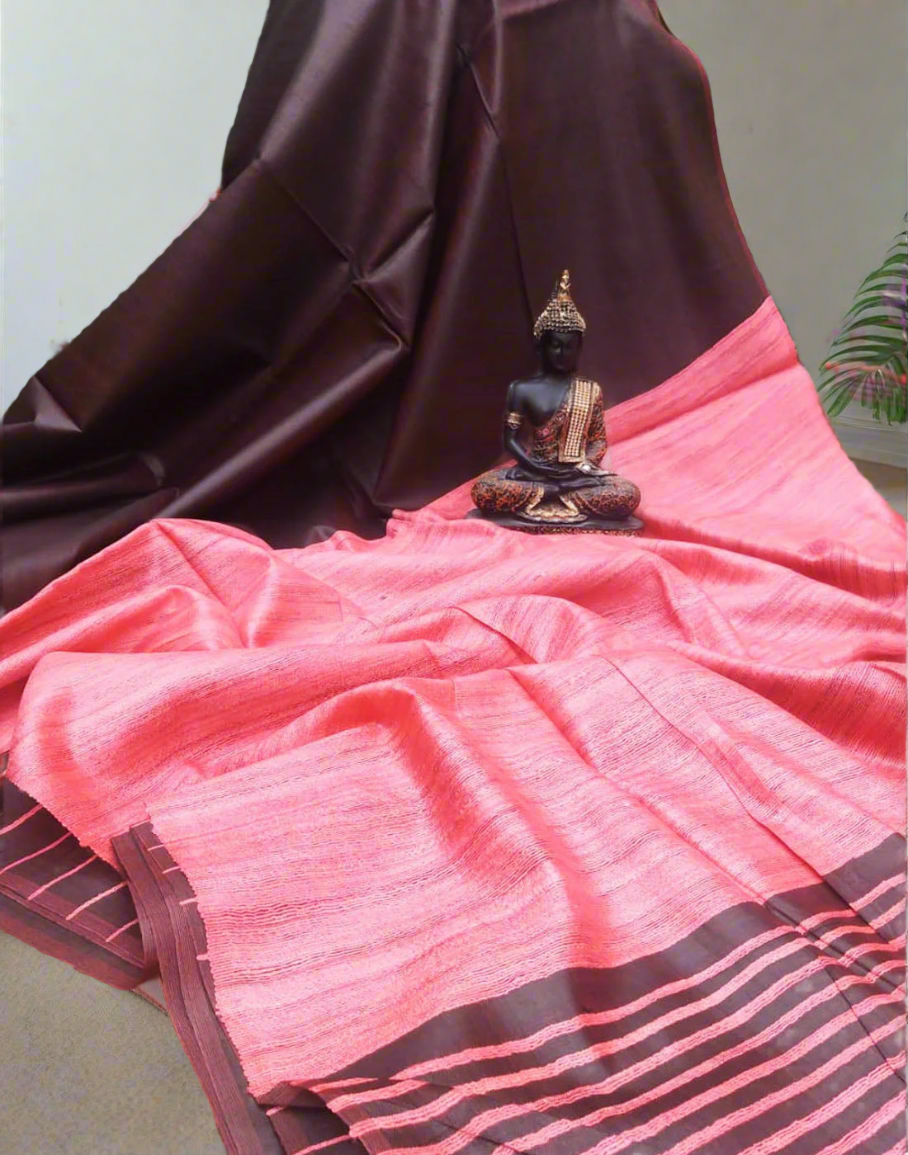 Brown and Pink Korean tussar ghicha pallu saree with staple body
