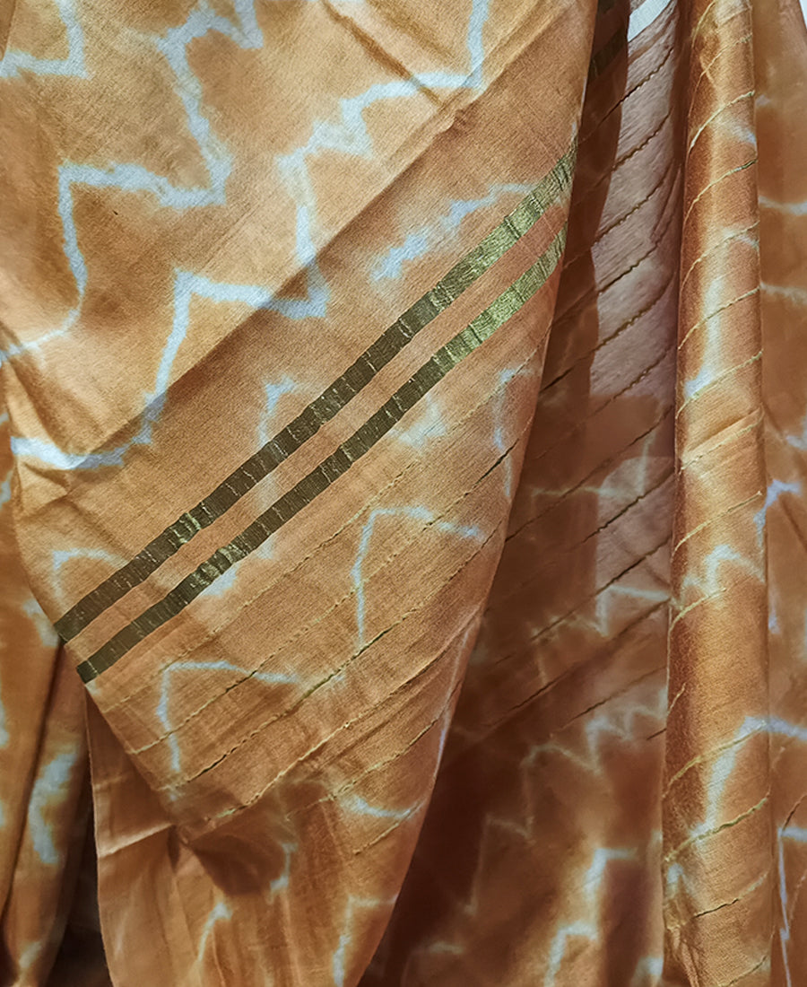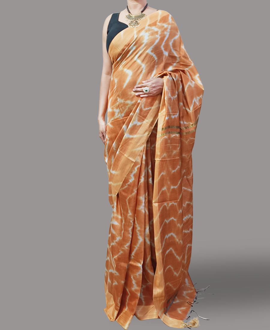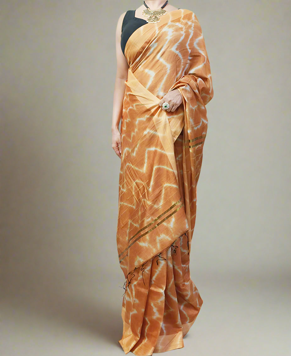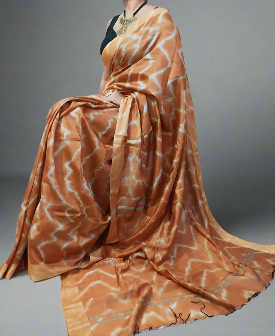 Crafted from luxurious Kota Silk, known for its lightweight and airy texture, this saree drapes effortlessly and promises comfort throughout the day. The earthy brown hues create a mesmerizing tie-dye pattern, adding a touch of modern flair to the traditional silk fabric. The tie-dye technique involves a meticulous process where sections of the fabric are skillfully bound and dyed, resulting in a unique and visually captivating design.