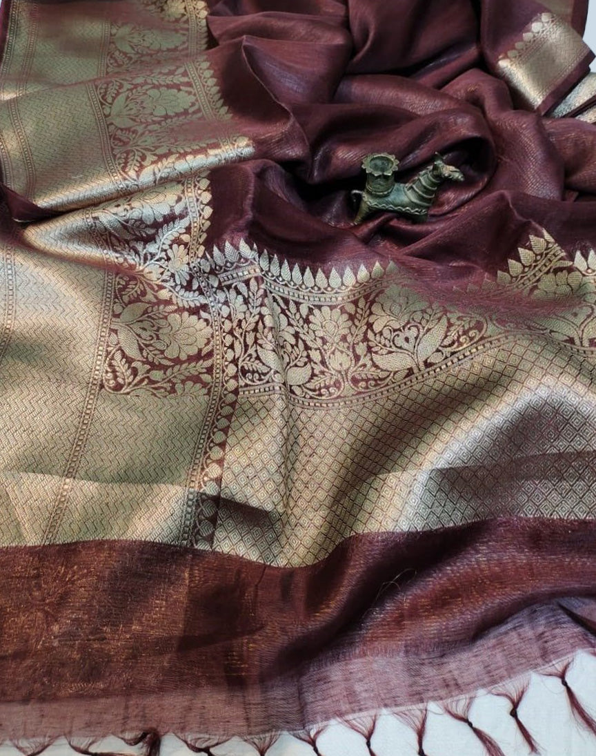 This coffee pure banarasi silk linen saree with contrast wide border will look elegant and flawless for any festivals.