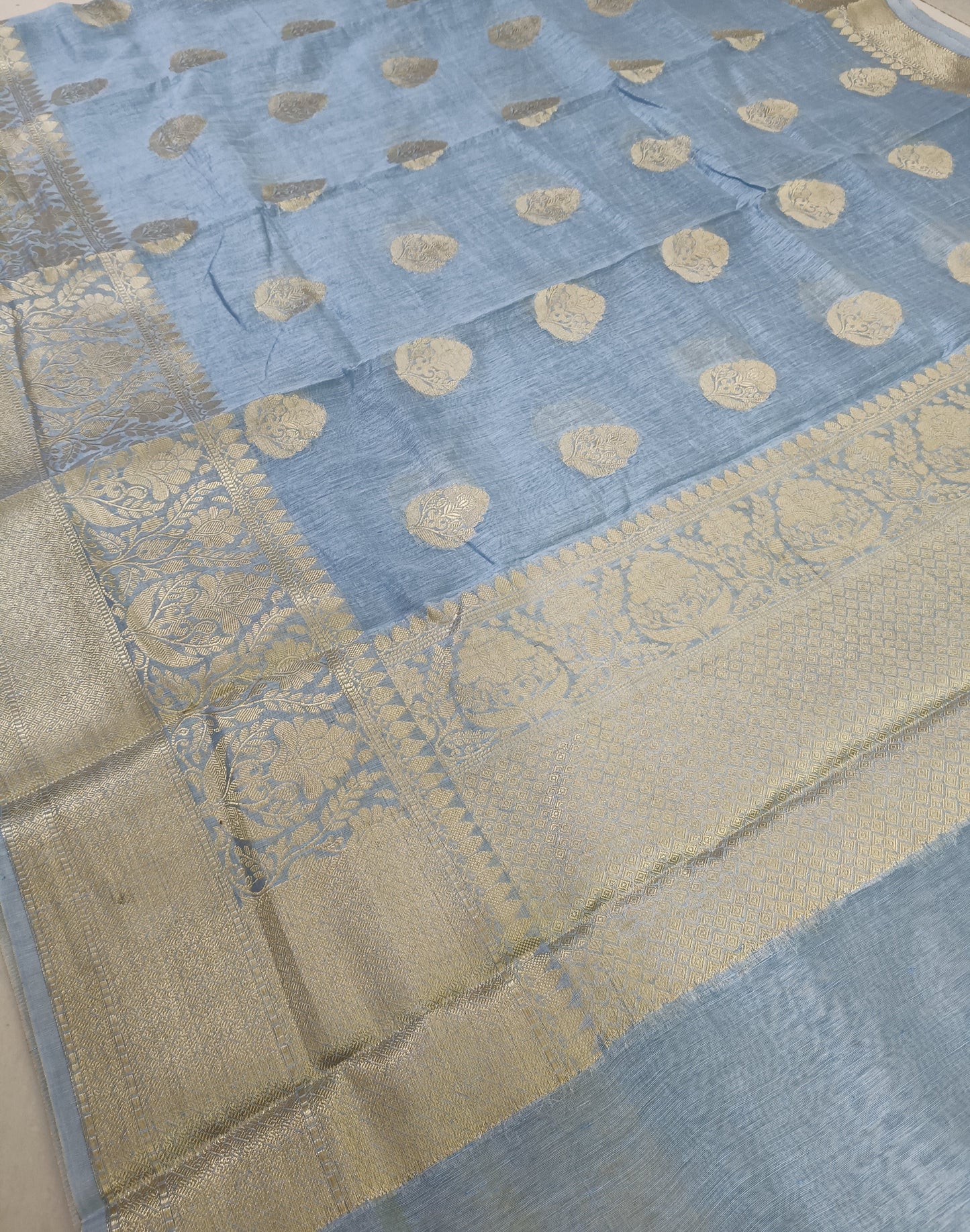 This very light silky fabric with subtle nubs and slubs of flax linen is ideal for creating traditional festive sarees for ladies and is extremely in demand due to its rich border which gives a glimpse of classic banarasi sarees.